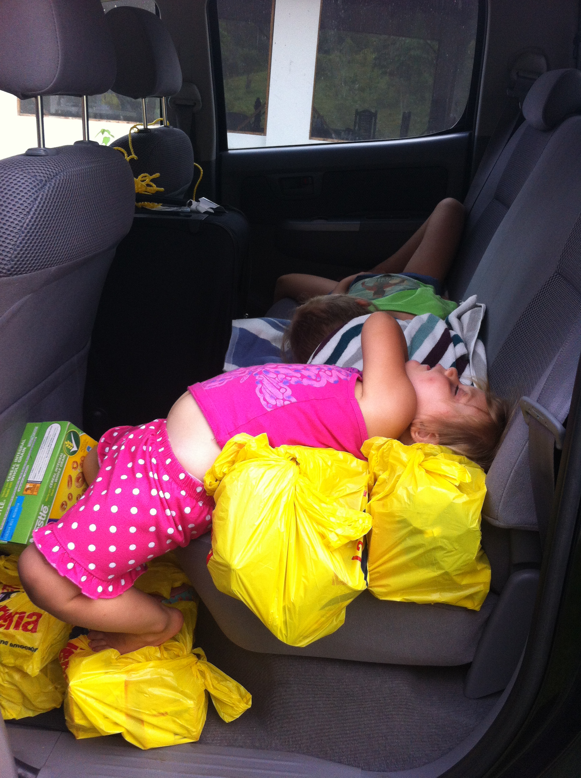 And..we’ve also picked up some Dominican driving habits. The girls started getting really hyper and over-amped on our drive home, so eventually we let them out of their seat belts and they went wild in the back seat, bumping along down our road. At some point, it became very quiet in the back seat. When we finally got home, you can see why: That’s Michelle in the foreground, passed out on a bunch of groceries; you can see part of Sofia in the background. Like I said, a trip to the city is exhausting and exciting now!