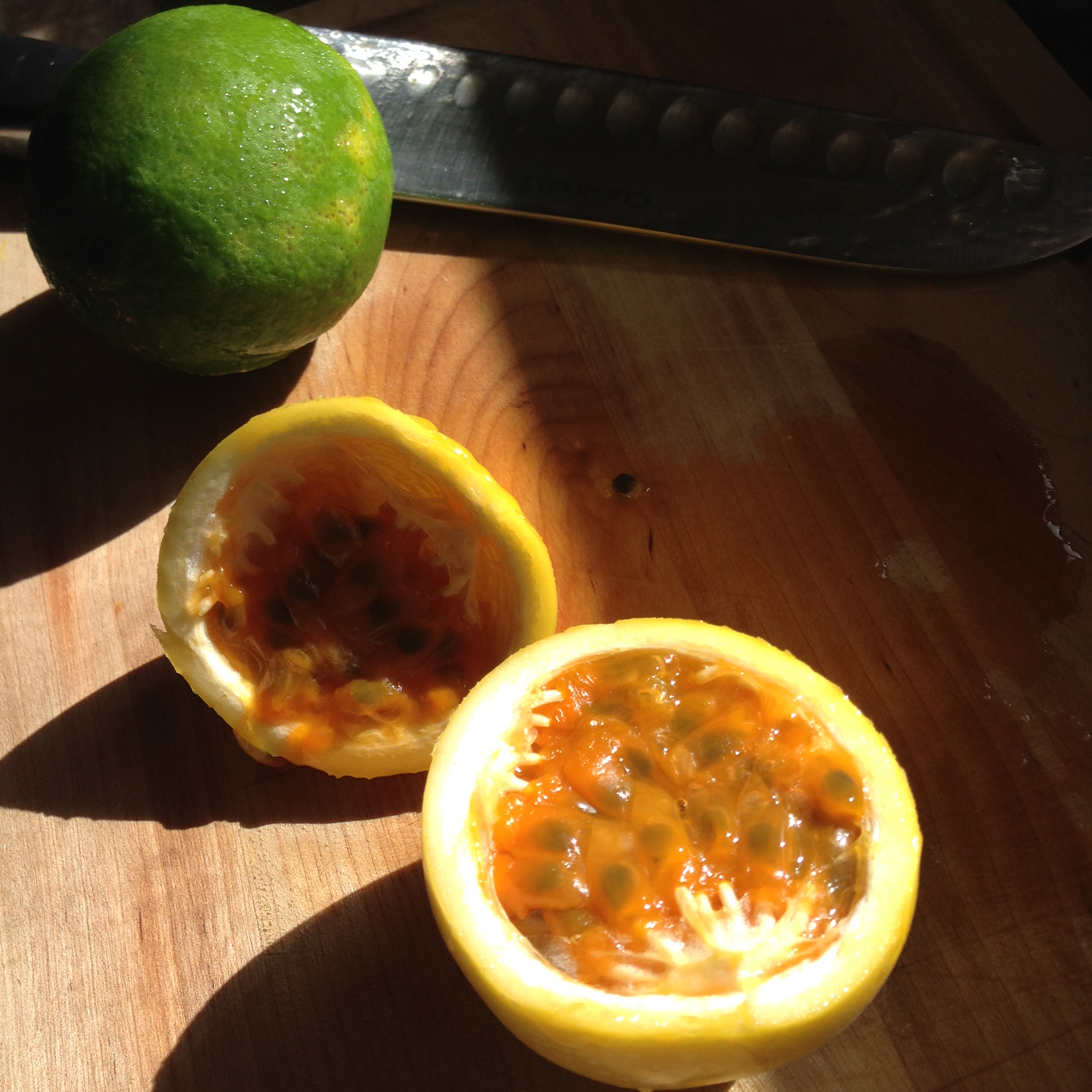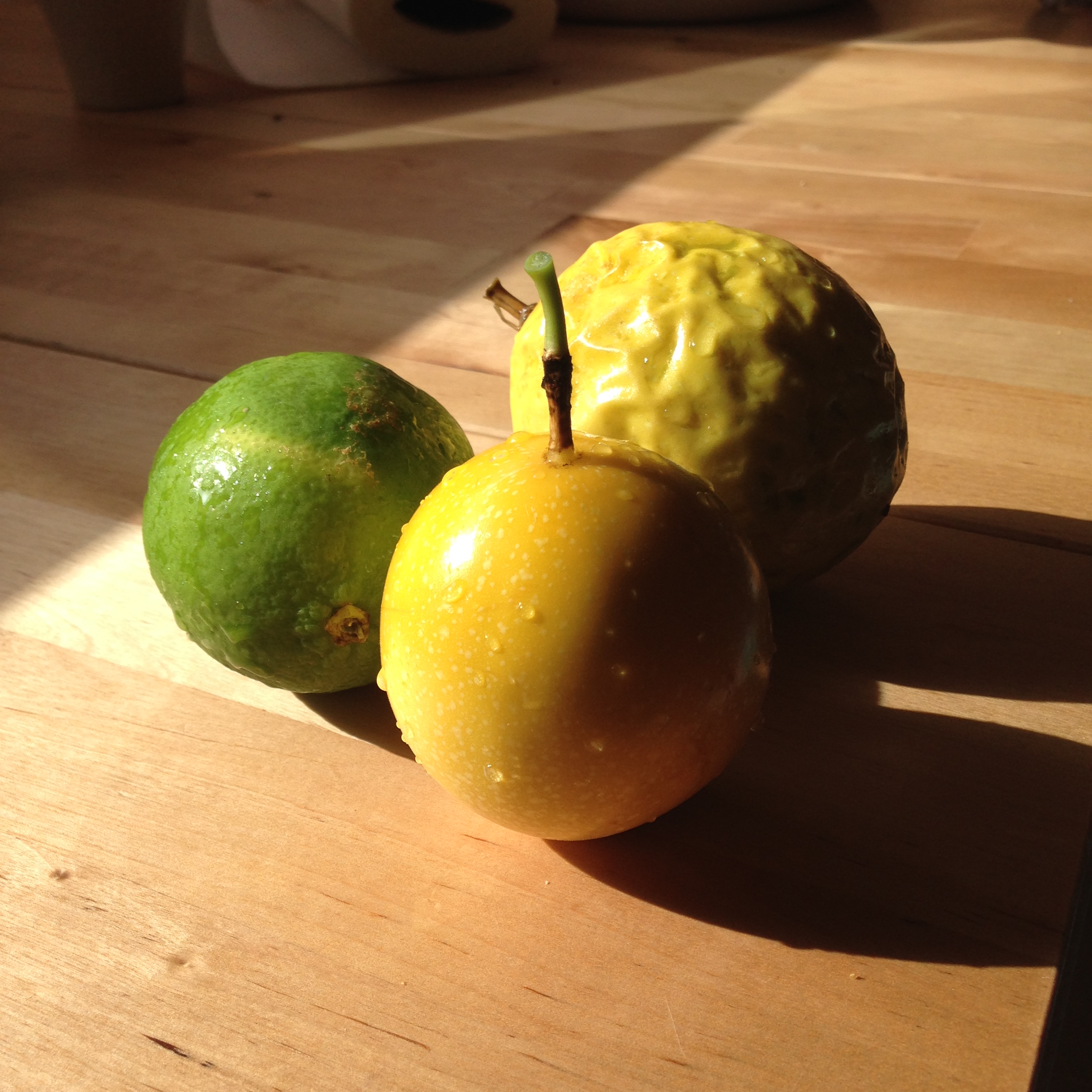Early morning light…a wrinkly Chinola (Passion Fruit aka Lilikoi in Hawaii), a lime and a smooth waxy Chinola that was resting on the path to El Rio…