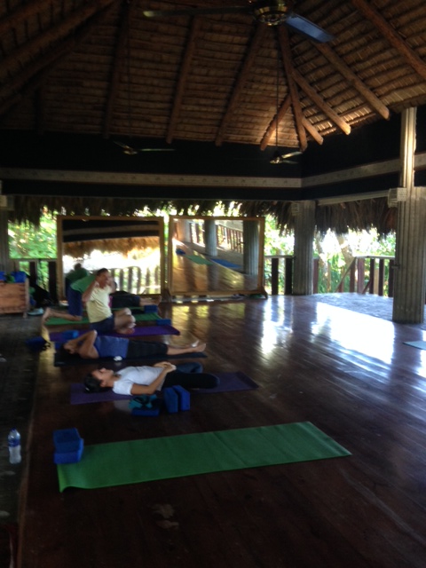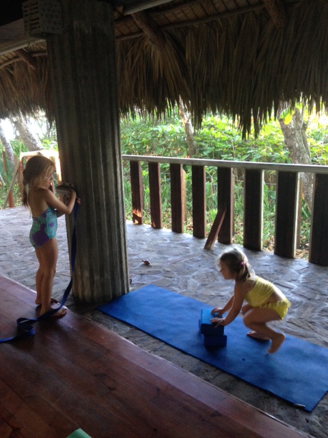 number threeOne of the many highlights of my stay at Natura Cabana was to attend a yoga class each morning, in an open air, thatched palm roof yoga studio on a platform overlooking the sea.  Kieran Barry, a kite-surfing, yoga kind of dude from UK, lives here for several months of the year and teaches a wonderful, multi-level, 90 minute yoga class, usually twice a day.  My body was so happy to go to yoga three days in a row in the morning, with the ocean breeze and oversize fans to gently stir the air and senses.  In this picture, Sofia and Michelle have come up to the yoga room in between classes, so that we could have our own “yoga class.”  When I talked with Lole and Kieran about my eco-retreat business, they were in agreement that the yoga space can be used for my groups, led by our yoga teachers, and Kieran is also open to adding in private yoga classes for our groups if we wish.