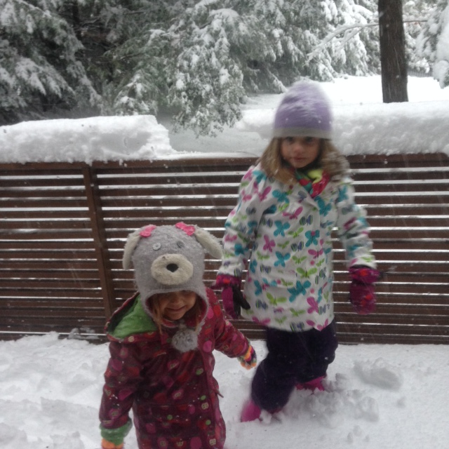 Sofia and Michelle were swaddled in snow attire and let loose on the deck and in the yard yesterday afternoon. Michelle lasted almost eight minutes, and Sofia had to be called in.