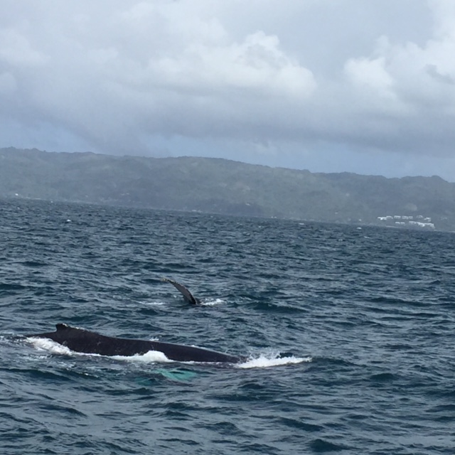 So we are on a short visit with Auntie B and Uncle F to a lovely beach house connected to my collaborative EcoRetreat group at Villa Serena in Las Galeras. It’s perfect for a family — or a group — to hang out in the expansive home near the hotel. There is a kitchen so we were able to bring our own groceries and cook, many bedrooms, right on the ocean…a yoga studio floating up some stairs..my Aunt and Uncle and I went on a boat whale watching today which is a lifetime experience. The humpback whales swim to Semana every year to have their babies here. We were overjoyed to meet up with a Mommy whale and her 6 wk old baby, along with two male escorts who were a bit in competition to be The One that gets to escort the Mommy around. The baby was incredibly playful, rolling around on top of her Mommy, flapping her tail, flipping up in the air. It was fabulous to witness. They are amazing creatures, and endangered.